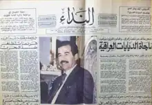 In August 1990 the Iraqi authorities shut down the al-Qabas newspaper and founded al-Nida using the requisitioned facilities of al-Qabas.[1][2] Al-Nida' was the sole newspaper published in Kuwait during this period.[3] It was distributed for free in Kuwait.[4] It was also sold in Jordan.[4] The newspaper carried speeches by Saddam Hussein and information of laws and decrees issues by the Iraqi authorities.[4]