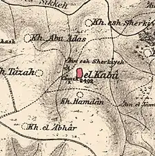 The village apparently changed hands several times in the 1948-1949 period,[22] Morris writes that the village was first depopulated on 22–23 October 1948.[2] However, in March 1949 the IDF mounted a series of major attacks eastwards, in the area of al-Qabu. The aim was to gain more territory, drive concentrations of Arabs eastwards, and create facts on the ground before a scheduled UN survey of Israeli and Jordanian positions.[26] Notwithstanding these orders, the Israeli UN liaison officers were at pains to describe to the UN observers that the military clashes were the result of Arab incursions and attacks.[27] In reality, Israeli troops were given direct orders to take al-Qabu, Khirbet Sanasin, al Jab'a, and Khirbet al-Hamam, even if it meant battling Jordanian troops.[28]