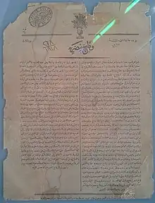 Al-Waqa'i' al-Misriyya (Arabic: الوقائع المصريّة / ALA-LC: al-Waqā’i‘ al-Miṣriyyah; meaning "the Egyptian affairs") was an Egyptian newspaper (now a government information bulletin) established in 1828 on the order of Muhammad Ali, originally called "Vekayi-i Misriye" (Ottoman Turkish: وقایع مصریه) and written in Ottoman Turkish in one column with an Arabic translation in a second column (Ottoman Turkish text was in the right one and Arabic text in the left one), and later in Arabic only[1] under the Arabic title.