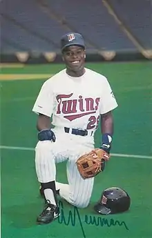 Prior to the beginning of the 1987 season, Newman was traded to the Minnesota Twins for career minor league pitcher Mike Shade. Upon first arriving in Minnesota and seeing Kirby Puckett take batting practice, Newman was quoted as saying, "He's the eighth wonder of the world!"[6] Newman saw much more playing time with the Twins, proving to be a valuable utility player and pinch runner, but had trouble hitting for average in 1987, including a 0–31 hitless streak.[7] Newman was a member of two World Series teams in 1987 and 1991 and had two hits, including a triple, and one walk and one RBI in eight World Series plate appearances.[8] His most productive season came in 1989 with the Twins, when he posted career-highs in stolen bases (25), hits (113), doubles (18), runs batted in (38), runs (62) and batting average (.253).