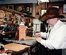 Al Shelton (June 27, 1920 – March 22, 2016) established the reputation of “Cowboy Artist to the Stars”,[1] creating custom-crafted leatherwork embossed with iconic cowpoke imagery in his workshop on Ventura Boulevard.[2] [3] Among his regular clientele was Steve McQueen, Ronald Reagan, Clark Gable, and many others. Several of his pieces of are featured at the Autry Museum of the American West.[1][2][4]