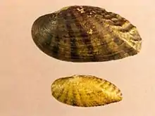 This aquatic bivalve mollusk is about 3 centimeters long with a thin yellow or brownish yellow shell. The nacre is mostly translucent with a salmon pink area.[3]