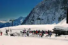 Alagna Valsesia is part of the huge Monterosa Ski area, a ski-resort at the feet of Monte Rosa which connects three different valleys in Piedmont and in Aosta Valley, with 180 km of runs. Through Passo dei Salati at an elevation of 2,980 metres (9,780 ft), Alagna is connected with Gressoney-La-Trinité and Champoluc. Since 2017, a new chair lift, brings from Cimalegna at an elevation of 3,030 metres (9,940 ft) just above the Passo dei Salati permitting direct access to the freerides routes in the Vallone delle Pisse.