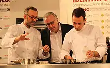 Alain Ducasse (centre) at the Congresso italiano di cucina d'autore with Massimo Bottura (left)