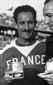 Mimoun rose to international prominence at the 1948 Summer Olympics. He was the runner-up in the 10,000 m final held at the Wembley Stadium on 31 July, behind the Czechoslovak runner Emil Zátopek. Zátopek was dominant and lapped all competitors bar Mimoun and bronze medallist Bertil Albertsson. Mimoun finished 47.8 seconds and more than 300 meters behind Zátopek.[24] Mimoun also ran in the 5,000 m event of the 1948 Summer Olympics but did not progress to the final round.[25] The following year he won the 5,000 m and 10,000 m French national championships titles and won his first major race at the International Cross Country Championships in Dublin, finishing ahead of compatriot Raphaël Pujazon in the individual event. He also led France to the team title.[26]