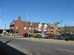The Alameda Apartments is a historic apartment building at the northeast corner of 7th Street and Elberon Avenue in Zanesville, Ohio, United States. Built circa 1910, the building was one of many apartments constructed during Zanesville's industrial and population boom of the early twentieth century. While the architect of the Gothic Revival building is unknown, it was most likely designed by Zanesville architect Harry C. Meyer. The two-story brick building includes a storefront on one corner and first- and second-floor apartments in the rest of its space. Its design features a bell-shaped gable at one corner, two oriel windows topped by small gables, brick corbels throughout, and dormers and brick chimneys projecting from the roof.[2]