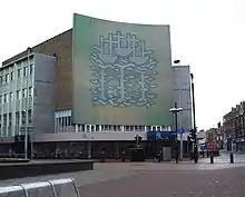 - Three Ships mural mosaic (1963; locally listed; Grade II listed 2019[4]) on the former Hull and East Riding Society Cooperative Store (and later a BHS), in Kingston upon Hull.[16] The 66 ft by 64 ft (20m x 19.5m) glass mosaic mural is on the exterior of the building (with two further murals inside). In 2019 there was an online petition[17] to get this mural Grade II listed by Historic England. Grade II listing was announced in November 2019.[18]