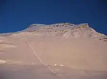 Cho Oyu: Showing the route from camp III at 7,500 m (24,606 ft), which crosses the "yellow bands", to get to the final flat summit plateau.
