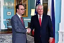 On May 10, 2017, President Rodrigo Duterte announced that Cayetano was appointed as Secretary of Foreign Affairs, following the expiration of the one-year appointment ban on losing candidates of the 2016 elections.[16] Cayetano replaced acting secretary Enrique Manalo, who assumed the post in March 2017 when the Commission on Appointments's (CA) rejected President Duterte's ad interim appointment of Perfecto Yasay Jr. due to the latter's citizenship concerns.[17]