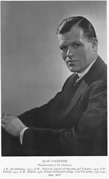 Alan Chester Valentine (February 23, 1901 – July 14, 1980) was an American academic who competed on the gold-medal winning American rugby union team in the 1924 Summer Olympics, was president of the University of Rochester, and served in the Truman Administration as a Marshall Plan official and as the first head of the Economic Stabilization Agency.[1]
