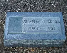 In July 1844 Beers opted to receive a farm, equipment, a blacksmith shop, and $1,000 from the Methodist Mission in lieu of passage back to Connecticut.[1] At this time the mission was re-organizing under the Reverend George Gary.[1] In 1846 Alanson formed a partnership with George Abernethy to buy grist mills at the island mills near Oregon City, Oregon, calling the enterprise the Oregon Milling Company.[1] The company milled lumber and ground flour.[5] Then prior to his death in 1853 he built a house to be used as a dormitory by the Oregon Institute, which the school then bought for $300 after his death and named Beers House.[1] The school also offered each of his children a scholarship.[1] Alanson Beers is buried at the Lee Mission Cemetery in Salem, Oregon.[3]