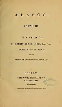 Alasco is an 1824 tragedy by Martin Archer Shee, the Irish painter and future President of the Royal Academy. While best known for his artworks Archer Shee also wrote poetry, two novels and this play. It was intended to be staged at the Theatre Royal, Covent Garden in London, but objections by the censor George Colman to the play's subject matter led to the Lord Chamberlain, the Scottish peer the Duke of Montrose to refuse it a license. Montrose and Colman were wary of any plays they regarded as touching on any revolutionary themes.[1] Archer Shee published the work with a lengthy preface defending the play, and it was performed at the unlicensed Surrey Theatre south of the River Thames in April 1824.[2]