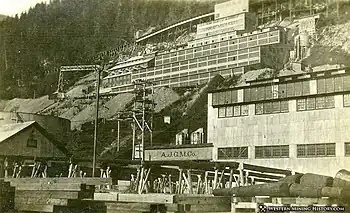 The Alaska-Juneau mine was located 3 miles (4.8 km) from Juneau.[3] The property also included the Lane & Hayward mine and the Bennet mine. The company's two stamp mills, driven exclusively by water power, were located on Gold Creek.[4] Its 30-stamp mill was in operation from 1896 to 1914.[1] The Ebner Gold Mining Company property adjoined the AJGMC on the northwest.[5]