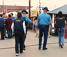 Two female DJJ officers, accompanied by two uniformed Alaska State Troopers, as they patrol the fairgrounds during the 2012 Tanana Valley State Fair.