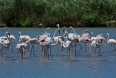 Stretching in the southeastern Adriatic Sea, the coast with a wealth of important habitats makes for a fascinating birdwatching location during peak migration with several wetlands, estuaries and hills provides diversity for both resident and migrant birds.[11] Maybe the most iconic bird of the coast is the vulnerable and extremely rare dalmatian pelican.[12] It breeds on inland lakes and coastal lagoons of Albania such as in Karavasta and Patoku Lagoon.[13][11] The greater flamingo is another prominent and important species that live in the region. It is the largest species of flamingos and widespread in Karavasta and Narta Lagoon.[14]