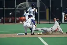 Belle was fined in 1996 for knocking down Brewers infielder Fernando Viña, who had blocked his way between bases.[14]