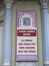 - ↑ The original sign at each end of the Albert Bridge read: "Officers in command of troops are requested to break step when passing over this bridge", which can be seen in the newsreel issued by British Pathe on 24 May 1954.[20]