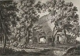 At one point, Jacques-Louis David, then composing his Oath of the Horatii (1784) at Rome, wished to take him to Paris. But Dies had reasons for not accepting the offer. He was courting a young Roman whom he subsequently married. Meanwhile, he had made the acquaintance of the engraver Giovanni Volpato, for whom he executed numerous drawings, and this no doubt suggested the plan, which he afterwards carried out, of publishing, in partnership with Jacob Wilhelm Mechau, Johann Christian Reinhart and Johann Friedrich Frauenholz,[5] the series of plates known as the Collection de vues pittoresques de l'Italie, published in seventy-two sheets at Nuremberg in 1799.[2]