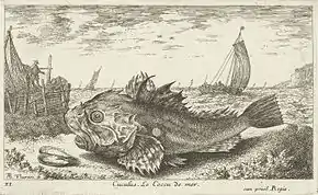 Flamen's best-known prints are his French landscape etchings[7] and his studies of both salt-water and fresh-water fish[8] and of birds. He also engraved the illustrations for a number of emblem books, including the anonymous Devises et emblemes d'amour often attributed to him but of which he denied being the author (first published in Paris, 1648), Augustin Chesneau's Orpheus Eucharisticus (Paris, 1657) and Adrien Gambart's La Vie symbolique du bienheureux François de Sales (Paris, 1664).[9] Most of his works were created in series published in small oblong books, typically consisting of 12 prints. The influence of Jacques Callot is clearly discernible. Flamen created also several prints for Jacobus van Merlen, an Antwerp engraver.[10] Flamen is estimated to have created about 625 items, of which perhaps 40% are emblems.[9]