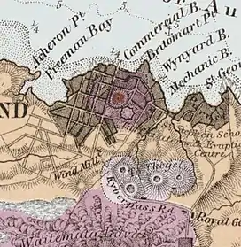 ![]() Ferdinand von Hochstetter's diagram of the Albert Park Volcano, superimposed onto the 1859 township of Auckland | |