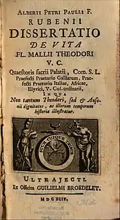 In 1694 Graevius edited and published Albert Rubens' Dissertatio de Vita Fl. Mallii Theodori, which describes the life of the Roman Emperor Theodosius the Great and his sons and provides textual sources. This book was deemed very important and was republished in a new edition in 1754 to a very positive review.[2]