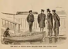 The A.E. Johnson had been running unattended and struck another ship, the schooner J. R. Mather, breaking the Johnson's main mast and bringing down her rigging. Hicks set out to sink the ship, along with the evidence of the killings, by drilling holes through the keel. He then took the money, about $230, and the possessions of the murdered crew and abandoned ship in a yawl, rowing for shore and landing about daybreak next to a farmer's field on Staten Island just above Fort Richmond (Battery Weed). Believing that he would not be caught, he made his way back home to Manhattan, stopping at saloons merrily drinking and making a spectacle of himself.[1][4]