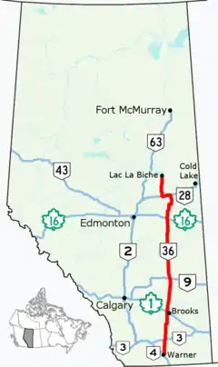 Alberta Provincial Highway No. 36, commonly referred to as Highway 36 and officially named Veterans Memorial Highway,[2] is a north-south highway in eastern Alberta, Canada that extends from Highway 4 near Warner to Highway 55 in Lac La Biche.[1] In 2013 Lac La Biche County unsuccessfully lobbied the Government of Alberta to renumber Highway 881 to Highway 36 from Lac La Biche north to Highway 63 south of Fort McMurray.[3][4]