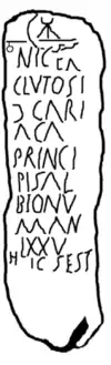 - ☧ NICER CLUTOSI (filius) C(astello) CARIACA PRINCIPIS ALBIONUM AN(norum) LXXV HI(c) S(itus) EST, which can be translated as " Nicer, [son] of Clutoso from the house of Cariaca, prince of the Albions, [died aged] 75 years, lies here."[3]