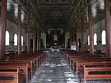 The original retablo is gone, although there are two smaller neo-gothic style ones at both ends of the transept. These smaller side retablos are painted to simulate three-dimensional carvings. The old pulpit is still being used. On both sides of the main altar are sacristies or storage-areas.