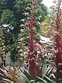 This large terrestrial bromeliad was once classified as Vriesea imperialis but is now recognized as part of the genus Alcantarea. It can be found growing on rocky slopes in the Serra dos Órgãos in Rio de Janeiro. It can tolerate dry conditions and full sunlight. Considered one of the giants of the genus, "its leathery leaves measuring 6 inches in width and 5 feet in length."[4] It will take up to forty years before producing an imposing red inflorescence that reaches 8 feet, or even ten feet (3 meters) in height. Its tank will hold up to thirty liters of rainwater.[5]
