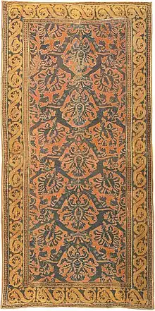After 1500, and following the expulsion of the Moors by King Ferdinand and Queen Isabella, Spanish carpet design began to prefer classically inspired European Renaissance styles to the middle eastern designs they had known.1Although the exact region to begin to produce the new style is not yet known, historians have attributed the move towards European design primarily to the Alcaraz in southern Castile.2 When executed by the Alcaraz designers, European Renaissance styles over-took the carpet field in the form of acanthus vinescrolls. On occasion, carpets motifs also included animal features within detailed design. 3 With the advance of European design, colors became more muted. 4 The shift in color palette was due to two main factors: the loss of the Moors saw the loss of master dyers and new dyes on the market were being experimented with. Popular color schemes of 16th century Alcaraz design include dark green on green and dark yellow on yellow.5