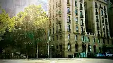 Alcaston House, located on the corner of Melbourne's Collins and Spring St, rises seven levels over a basement, and is one Melbourne's first mixed-use Art Deco buildings. It was designed by the firm of architects, A. and K. Henderson and erected by T Donald and Co. in 1929-30.[1] The Renaissance Revival complex was erected for the trustees of Dr EM James, whose home previously occupied the land. Located at 2 Collins St, Melbourne; it is amongst is an early example of multi-storey residential accommodation in the city at a time when the post-war preference for flat living in Europe and the USA was becoming manifest in Australia. The art deco building is directly opposite the Old Treasury Building and Victoria's Parliament Building.[2]