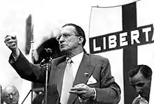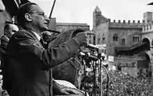 In 1954, De Gasperi also had to give up the leadership of the party,[18] when Amintore Fanfani was appointed new Secretary of the Christian Democracy in June.[19]