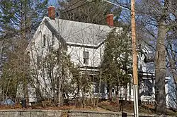 The Alden Batchelder House stands north of downtown Reading, on a triangular parcel of land at the junction of Main Street (Massachusetts Route 28) and Charles Street, across Main Street from the Laurel Hill Cemetery. It is a 2+1⁄2-story wood-frame structure, with a side-gable roof and clapboarded exterior. It is oriented facing south, and is screened from the streets on either side by trees; a stone retaining wall lines the properties eastern and western sides. The roof has relatively deep eaves, studded with a few single decorative brackets. At the center of the main facade there is a gable at the roof line, which is echoed in the roof of the single-story porch, which wraps around the side of the house. The porch features turned balusters and posts. The first-floor windows are elongated, with deep moldings.[2]