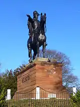 A statue of the first Duke of Wellington mounted on his horse, Copenhagen, is situated on Round Hill behind the Royal Garrison Church. The statue is 30 ft (9.1 m) high, 26 ft (7.9 m) from nose to tail, over 22 ft (6.7 m) in girth, weighs 40 tons and is intricately detailed including musculature and veins. It was designed and built by Matthew Cotes Wyatt who used recycled bronze from cannons that were captured at the Battle of Waterloo. It took thirty men over three years to finish the project.