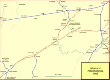 The London and Southampton Railway opened its main line throughout in 1839. The company changed its name to London and South Western Railway (LSWR) in 1840. In 1845 a branch line to Guildford from Woking was opened, and it was extended to Godalming in 1849.[1] To the west of Guildford lay Farnham and Alton, both important in the brewing industry, and transporting their product to London and other population centres by road to the railhead at Winchfield,[2] and a branch line to serve that traffic was an attractive proposition. In addition there was potential for useful quarrying at Alton if a railway connection were provided.[3]
