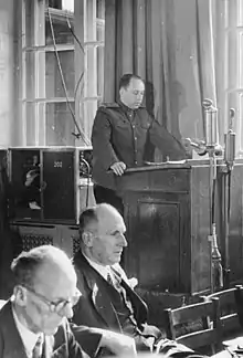 From 1941, Dymshits worked as a political officer in the army newspaper Znamja pobedy and gave lectures to soldiers about the state of the German army in Russia. He also published short reports and literary sketches about his experiences at the front. He was also responsible for the propaganda texts that were broadcast once a week across the front line to the German soldiers via loudspeaker trucks.[3]