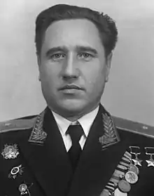 By the end of the war, he had flown 412 sorties, fought in 96 aerial engagements, gained one shared shootdown and 46 solo victories.[3] He was nominated for the title of Hero of the Soviet Union again on 12 June 1945, but it was not awarded until 23 February 1948.[7]