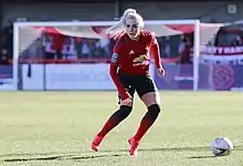 On 20 September, she made her Championship debut in a 3–0 win against Sheffield United.[16] On 18 November, she scored her first goal for Manchester United with a penalty spot in a 5–0 away win at Crystal Palace.[17] Under her leadership, Manchester United won the Championship and gained promotion to the FA WSL in their debut season.[18]