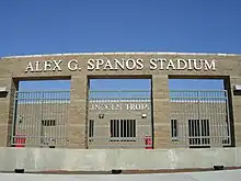 Spanos donated $500,000 to renovate the Fox Theatre in downtown Stockton, and with the approval of the City of Stockton, renamed the facility the Fox California Bob Hope Theatre. The Alex G. Spanos Center at University of the Pacific in Stockton, the Alex G. Spanos Stadium for Lincoln High School in Stockton, the Alex G. Spanos Sports and Recreation Complex in Sacramento, the Alex G. Spanos Training Center at UCSD are named after him. From 2006 to 2022, the Mustang Memorial Field at Cal Poly also bore his name, after he donated $8 million to renovate the stadium.[9]