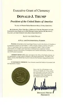 In December 2020, U.S. President Donald Trump pardoned Van der Zwaan in an eleventh-hour pardon prior to the end of Trump's four-year presidential term.[40] The pardon rescinds his U.S. criminal record, allowing him to legally return to the United States.