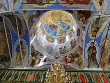 This renewed prosperity was reflected in the monastic structures erected in the 1640s. In 1644, when the five-domed Transfiguration Cathedral was finished, Tsar Mikhail Feodorovich presented to the monks a golden ark for keeping St Alexander's relics there. A belfry of the Trinity cloister was built in three tiers and crowned with three tents in 1649. Most of the monastic cells date back to the 1670s. The roomy Trinity Cathedral was completed by 1695. The last structure to be erected within monastery walls was the hospital chapel of St John of Damascus (1718).