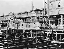 By November 1901, the steamer Idaho was in a critical condition and in need of overhaul. The City Council gave the Wayside Mission permission to build a gridiron at the foot of Jackson street and put the ship on it.[64] But during a severe storm in January 1902, the Idaho broke from its mooring with patients and staff on board. As it was tossed by the waves, its stern was severely damaged by logs that were anchored nearby. People were evacuated from the ship by the city's fire department, and crews of nearby anchored vessels helped to save the boat from sinking, securing it near the wharf.[65] The ship survived the storm and proceeded to be re-moored at its original position.[60][55][66]