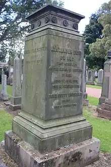 Alexander Duff died in Sidmouth, Devon[14] on 12 February 1878. He is buried with his wife, Ann Scott Drysdale, in the north-east section of the Grange Cemetery in Edinburgh.