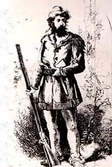 In 1790, McGuffey and his best friend Duncan McArthur volunteered to be scouts at Fort Pitt, an American Army stronghold.[12] Samuel Brady trained and tested their ability to hunt, shoot, run, and swim. They were also tested on their ability to spy on tribesmen and how they would manage confrontations with Native Americans. Both Duncan and McGuffey were accepted and sent out on military expeditions. They were outfitted in a homespun suit, buckskin leggings, and a jerkin, and they were given a tomahawk and a dirk. The tomahawk was used to cut trees to create a shelter and to cut their way through the forests[13] of Ohio and Pennsylvania.[14] McGuffey first served out of a small fort near Wheeling, West Virginia, and operated in the Ohio River Valley.[12]