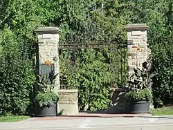 Alexander Muir Memorial Gardens feature formal flower gardens with roses,[2] herbs and multi-tiered beds.[5] There is a decorative gate at the Yonge Street entrance bearing a plaque depicting a maple leaf to commemorate Muir and the park's 1952 reopening. Inside the park, there is a stone retaining wall that is also a monument dedicated to Muir inscribed with the refrain of The Maple Leaf Forever.[2] The Gardens contain stone balconies and steps, crushed brick pathways and sunken gardens enclosed by maple, willow and oak trees.[6]