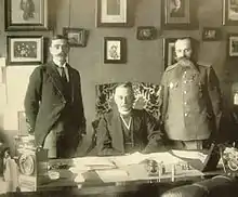 In November 1913 or May 1914, Protopopov was appointed as vice-president of the Imperial Duma under Mikhail Rodzianko, serving as Deputy Speaker from 1914 to 1916. Protopopov founded a newspaper Russkaya Volya ("The Will of Russia") which was financed by the banks and appointed Nikolay Gredeskul and Alexander Amfiteatrov as journalists.[3][4] According to Joseph T. Fuhrmann, Protopopov was hospitalized from the end of 1915 for six full months in the clinic of Peter Badmayev.[5] In Spring 1916, at the request of Rodzianko, Protopopov led a delegation of Duma members with Pavel Milyukov to strengthen the ties with the Entente powers, Russia's western allies in World War I.[6] Protopopov met with the German industrialist and politician Hugo Stinnes, the banker Fritz M. Warburg, and the Swedish Minister of Foreign Affairs Knut Wallenberg.[7] Protopopov faced a violently hostile reception from the pro-British Russian liberals upon his return from France and the United Kingdom, and in self-defence alleged that Warburg had initiated the talks.[8] Protopopov's secret contacts on peace and a swap between Russia and Germany became a scandal, which according to The New York Times was an indication of the rapprochement between the Russian and German Governments.[9] Protopopov was widely suspected of contacts with German diplomat Hellmuth Lucius von Stoedten.[10][11][12] In 1925, the Nazi journalist Theodor Fritsch rewrote the story, alleging Warburg had wrecked Imperial Germany, advanced the Communist cause, and changed the entire course of European history.[13]