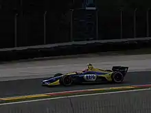 Rossi began the Indianapolis 500 from the last row on the grid, starting in 32nd place.[79] He completed a series of impressive overtakes throughout the race,[80] leading him to a fourth-place finish.[81] The following week in Detroit, Rossi finished third in race one.[82] He then qualified on pole for the second race and led 46 of the first 63 laps;[83] however, he was pressured late in the race by teammate Ryan Hunter-Reay. Rossi proceeded to lock his brakes, overshooting the upcoming turn and leading to a puncture. He was forced to pit, reentering the track in 13th and finishing in 12th.[83] Rossi rebounded later in the season to win the pole and the race at Mid-Ohio, using a two-stop strategy.[84][85] The win moved Rossi into second in the Drivers' Championship standings, 46 points behind Scott Dixon.[84] Rossi won the following race at Pocono as well,[86] though the event was overshadowed by a serious accident early in the race involving Wickens (who was injured and airlifted to a local hospital), resulting in a red flag period.[87] At Gateway, Rossi used fuel strategy to finish second, gaining a few points on Dixon.[88] After an eighth-place finish at Portland,[89] Rossi entered the final race at Sonoma 29 points behind Dixon.[90] At the start, he broke his front wing after contact with Andretti, dropping him back in the field.[91] He recovered to place seventh in the race,[92] finishing a total of 57 points behind Dixon in the championship.[93]