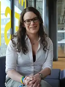Born in Linköping in 1974, Alexandra Larsson was one of the most industrious girls at school but felt uncomfortable. From the internet, she discovered that there were others who had the same sexual feelings as hers. When she joined the Air Force, she first hid behind her uniform but then decided to open up, revealing her outlook in a power-point presentation. It made her feel much better.[2] After coming out, she took part in the Stockholm Pride Parade, walking beside Sweden's chief of defence and the minister of defence. In connection with a 2014 conference on "Perspectives on Transgender Military Service from Around the Globe", she commented: "I’m sure their presence made 50 more people come out. That aspect of symbolic leadership is so, so important."[4]