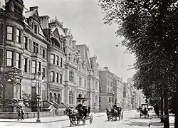 The end of the 19th century marked the heyday of the horse. Long considered as the century of steam and railways, the 19th century was above all an equine century. Rail transport and horse-drawn transport were complementary. During the Gilded Age the equine population in the United States rose from 7 million in 1860 to 25 million in 1900. Although town horses only represented 11 to 12% of this population, their importance in urban development was considerably greater. In 1900, the average density was 426 horses per square mile in the 46 largest cities of the United States, and 500 in New York City and Chicago.[5] In 1900, 130,000 horses lived and worked in Manhattan, 74,000 in Chicago, and 51,000 in Philadelphia. In 1879, The New York Times wrote: "New York must move on wheels, the whole population must drive... This is obviously a stable city".[6]